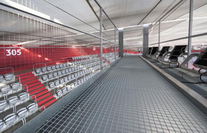 2018 wurde ein umlaufender Wartungssteg im Dachraum zwischen Unterdecke und Kissendach - parallel zum neuen Markenauftritt des Fußballvereins - eingebaut, der zusätzlich die neuen rückwärtigen Flutlichtbühnen im Dachraum anbindet.