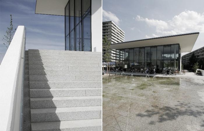 Der Standort des Cafeneubaus erschwerte die Baudurchführung: Das Tunnelbauwerk des Petueltunnels und die angrenzende Betriebsstation durften statisch nicht belastet werden. In enger Zusammenarbeit zwischen Hoch-, Tief- und Gartenbau konnte der Bau trotz schwieriger Arbeitsbedingungen in kurzer Bauzeit erfolgen.