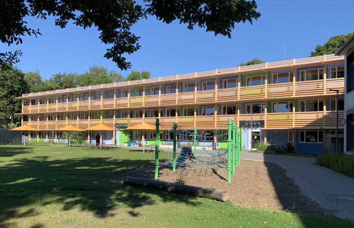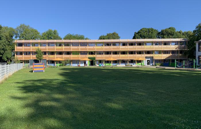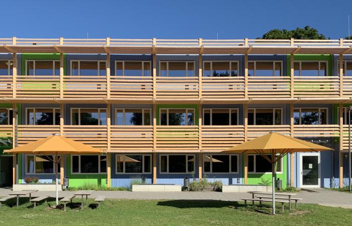 Gleich einem pop-up wurde der Sonnenschutz in der Erweiterung der Grundschule der Weißenseestraße errichtet, um den neuen Modulbau vor starker Aufheizung im Sommer zu schützen.