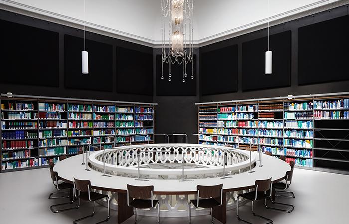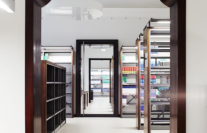 Die Beseitigung brandschutztechnischer Mängel und die Überarbeitung der Fassaden im denkmalgeschützten Bestand standen im Vordergrund der Maßnahme, gleichzeitig wurde jedoch die funktionale und räumliche Ausstattung der Fachbibliothek substantiell erweitert. Sie bietet Interessierten und Studenten ein zeitgemäßes Arbeitsumfeld an hochwertig ausgestatteten Leseplätzen.